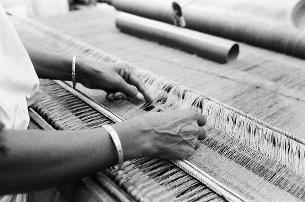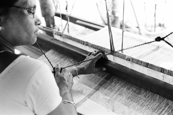 The fly shuttle loom which is used in Assam and Meghalaya is a bigger loom set up outside or in a workshop with a wooden frame and a plank on which the weaver sits. Often bamboo sticks are used for support or as thinner sticks for warp techniques. The loom is wide and fabric of up to 52” can be woven on it.
