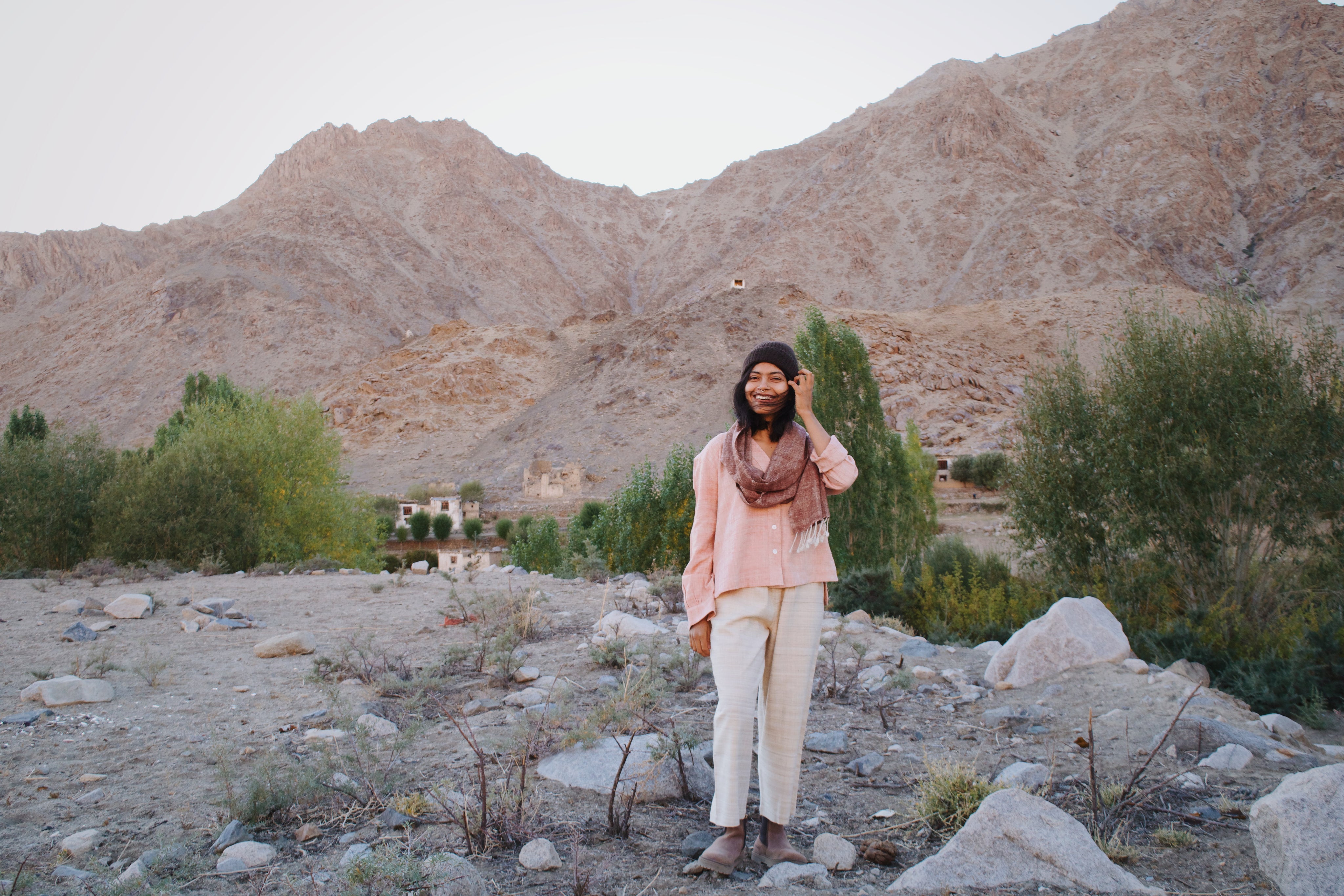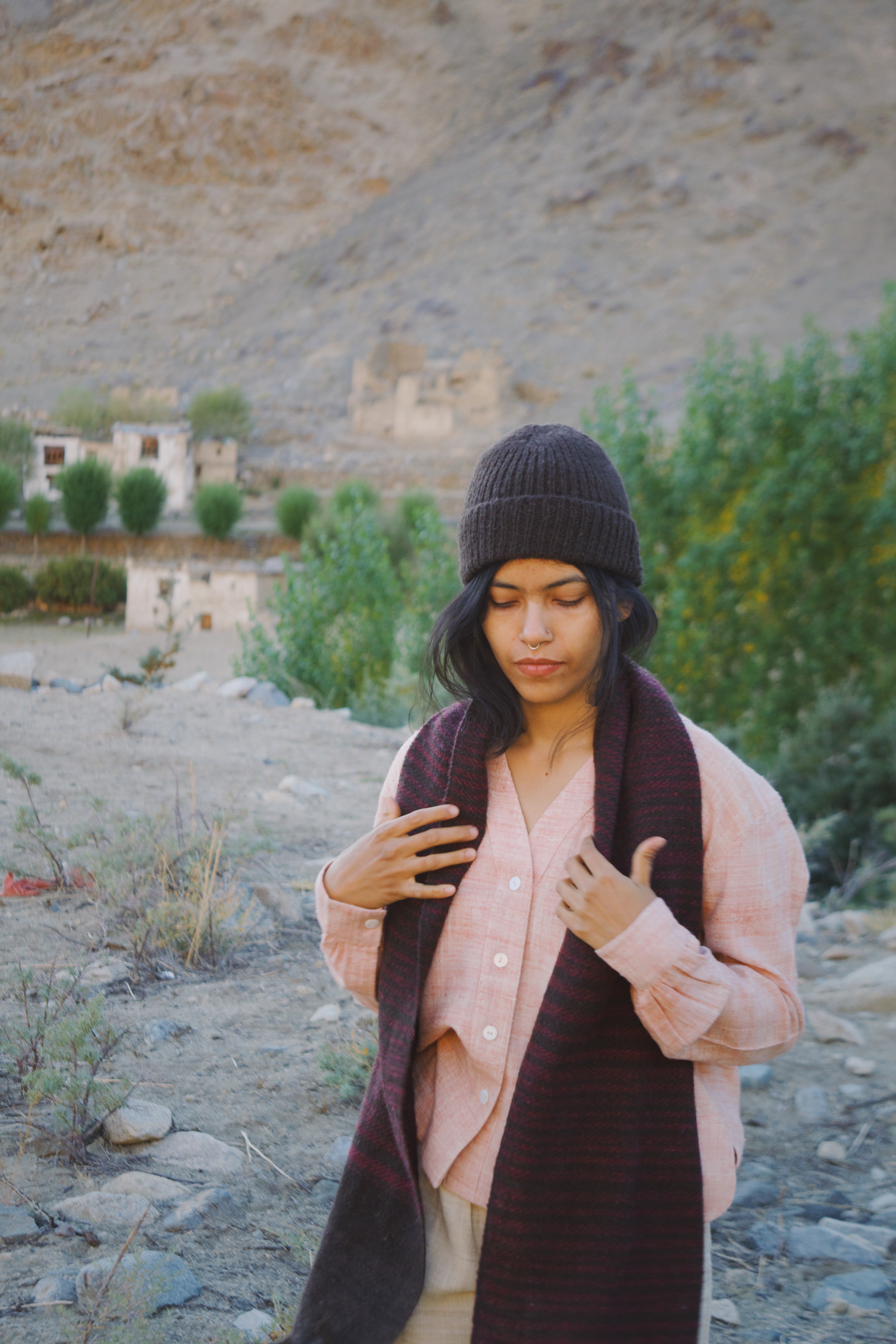This beanie is hand-spun and hand-knitted by our team in Ladakh. The yarn is a mix of different colors of yak wool. The beanie is knitted with yak wool from the Changthang Plateau shorn by the nomad community. It is a very soft yarn and despite its light weight, a very warm beanie.