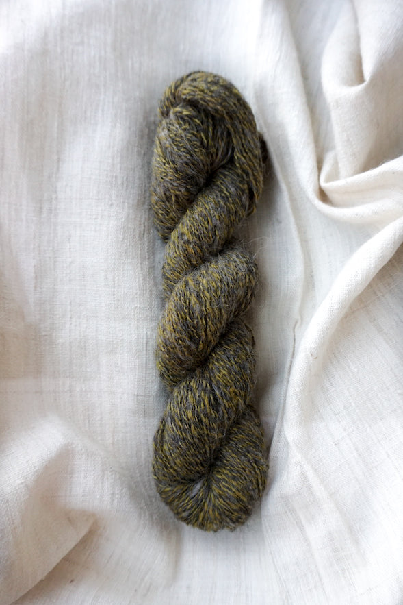 This handspun yarn is a combination of lambswool and eri silk. It is a fine two ply, joining two of our main materials: eri silk from Assam and lambswool from Ladakh. Spinning yarn is the second step in making woolen fabric and a wonderful, loosely spun yarn for weaving, knitting or felting. Before it is spun it has been skirted - the removal of thorns and other dirt, then washed by hand and machine carded. The sheep live at an altitude between 4000m and 5000m, therefore the wool promises excellent warmth for the colder days. Eri silk gives it strength and extra softness. The handspinning assures a 100% pure and natural fiber. It is spun and plied by our team in Himachal Pradesh.