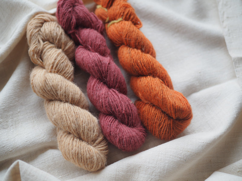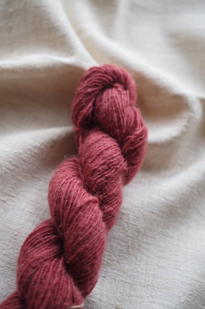 This handspun yarn is naturally dyed with Lac. This process is completely organic and we can assure a good color fastness. Spinning yarn is the second step in making woolen fabric and a wonderful, loosely spun yarn for weaving, knitting or felting. Before it is spun it has been skirted - the removal of thorns and other dirt, then washed by hand and machine carded. It comes from the sheep of our team from Changthang. The sheep live at an altitude between 4000m and 5000m, therefore the wool promises excellent warmth for the colder days. The handspinning assures a 100% pure and natural sheep wool. It is spun by our team of settled nomads close to the city of Leh, Ladakh. The wool is hand-dyed by Angtak & Catherine in Ladakh.