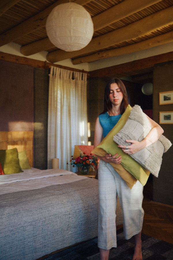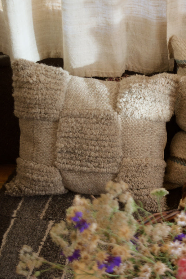 This pillow case is made from handspun sheep wool woven on the backstrap loom. It features a plain weave as well as a pile weave. In Ladakh, plain weave is called "Gyerrey" and pile weave is called "tsug den". The pillow cases are woven and stitched by our team in Ladakh. The opening is at the back with an envelope closure. The back is made of handspun and handwoven indigenous undyed cotton from Gujarat. The pillow case comes with an insert.