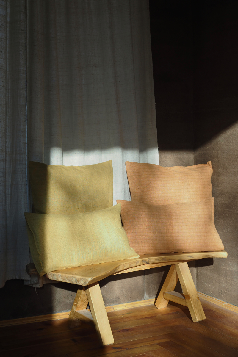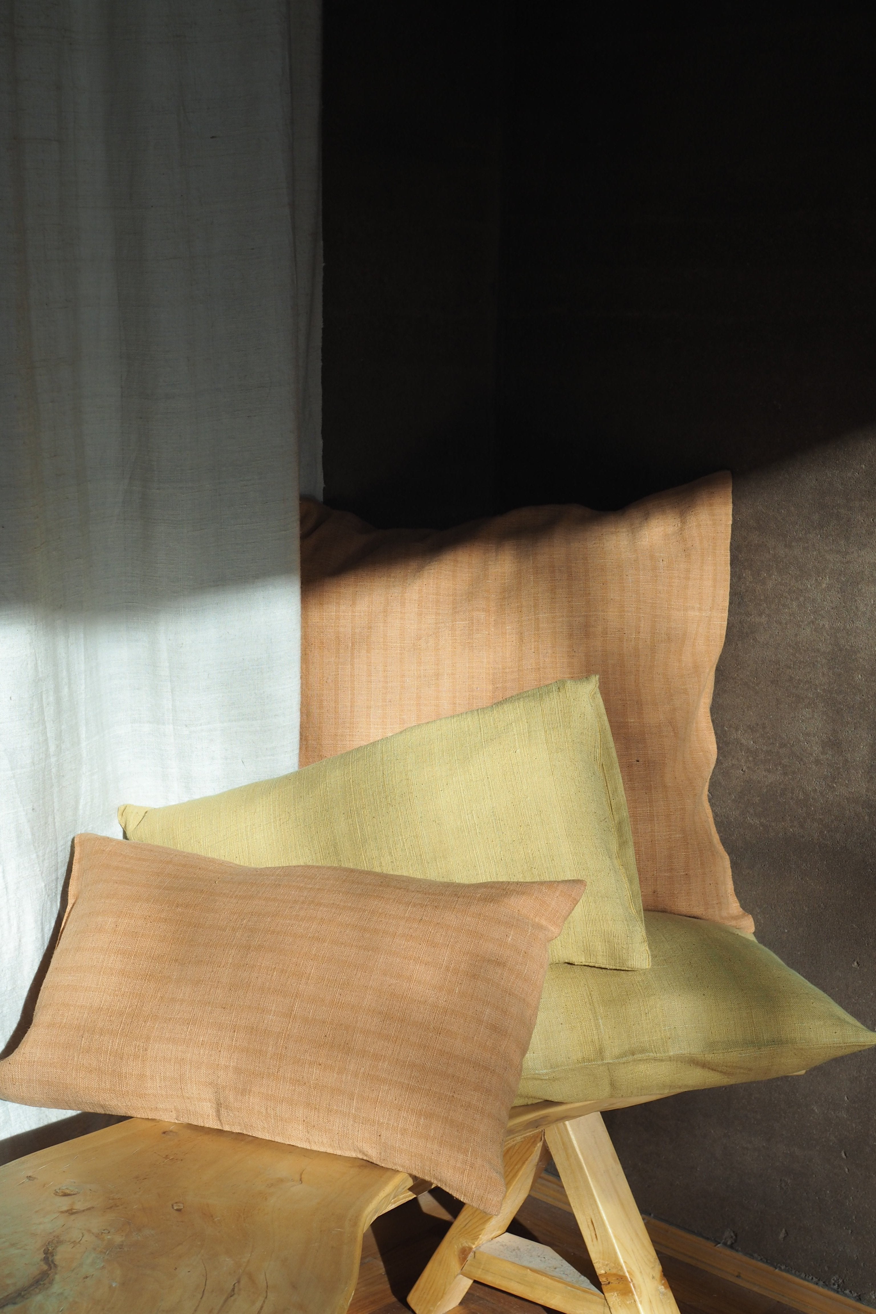 This pillow case is made from the indigenous black cotton, also called kala cotton, of Gujarat, a state in Western India. This type of cotton is entirely rain-fed and naturally resilient to pests compared to conventional cotton. It is hand-spun by a community of spinners in Gujarat and hand-woven and dyed by our team in Assam and stitched in our studio in Ladakh. The yarn is dyed with madder root and pomegranate peels and it has a rustic texture as the yarn is a thicker one. The pillow case closes with an envelope closure at the back.
