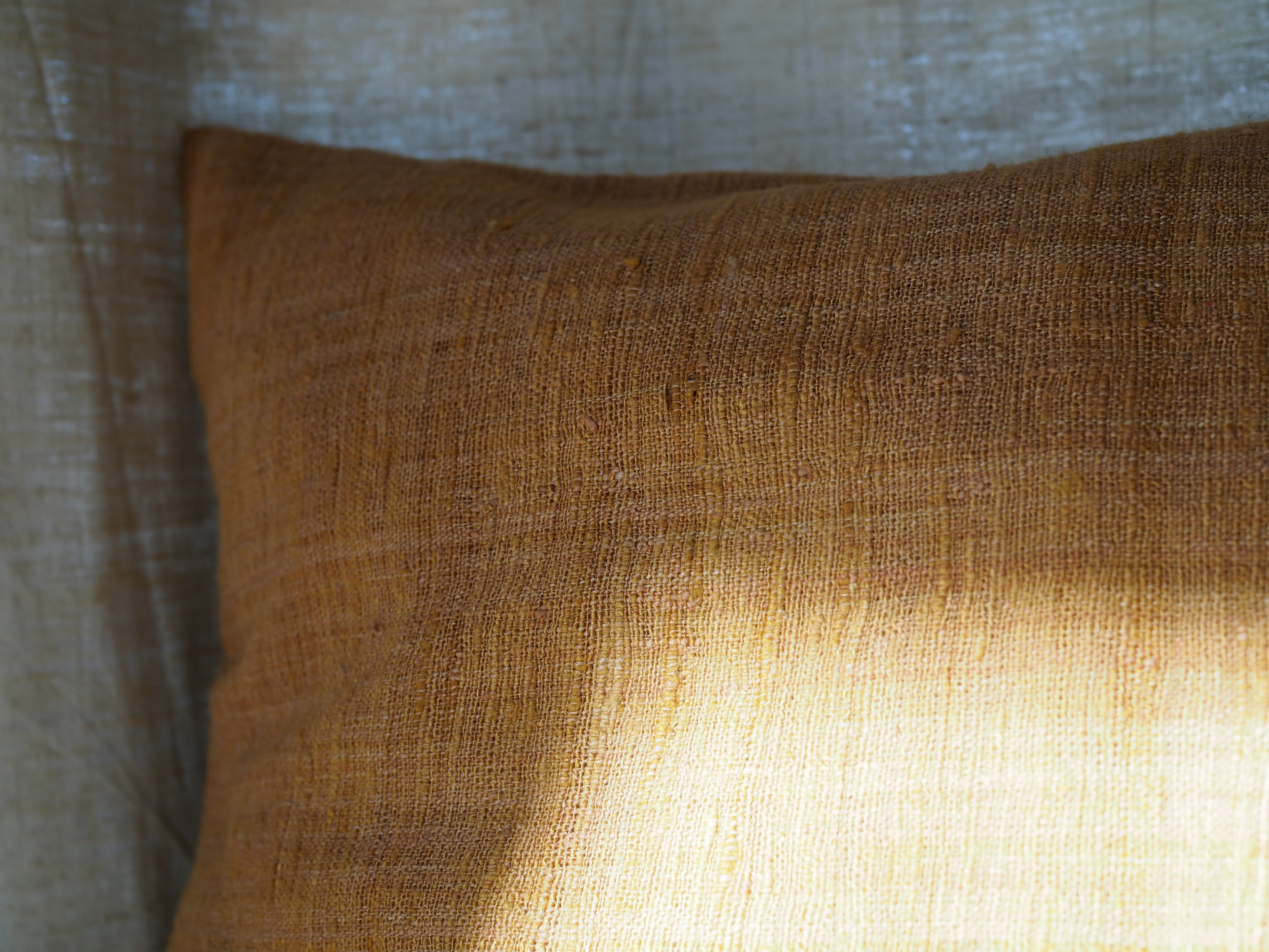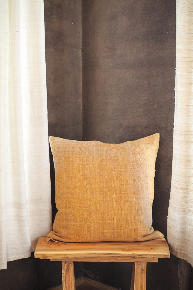 This pillow case is hand-spun and hand-woven by our team in Assam and stitched in our studio in Ladakh. The yarn is dyed with madder and jackfruit bark and it has a rustic texture as the yarn is a thicker one. The silk is called eri silk and cultivated by Assamese tribal communities South West of Guwahati. It is a wild silk and the moth leaves a hole in the cocoon as it has to be empty before it can be processed. Therefore it has a structure which is rather similar to linen. The pillow case closes with an envelope closure at the back.