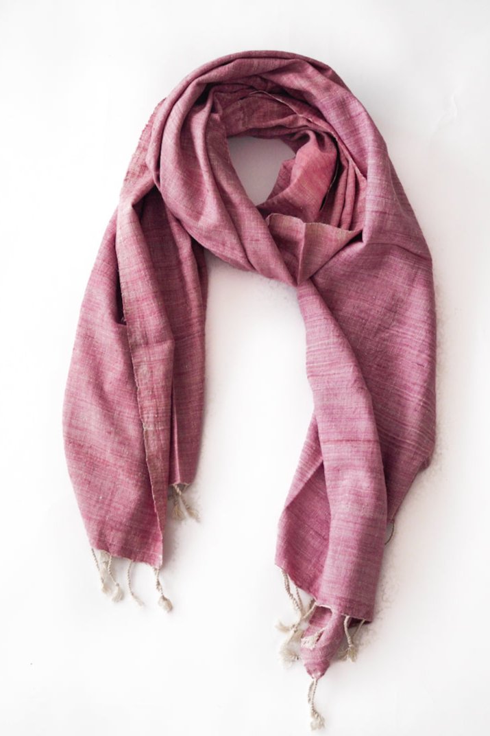 This scarf is hand-spun and hand-woven by our team in Assam. The silk is called eri silk and cultivated by Assamese tribal communities South West of Guwahati. It is a wild silk and the moth leaves a hole in the cocoon as it has to be empty before it can be processed. Therefore it has a structure which is rather similar to linen.