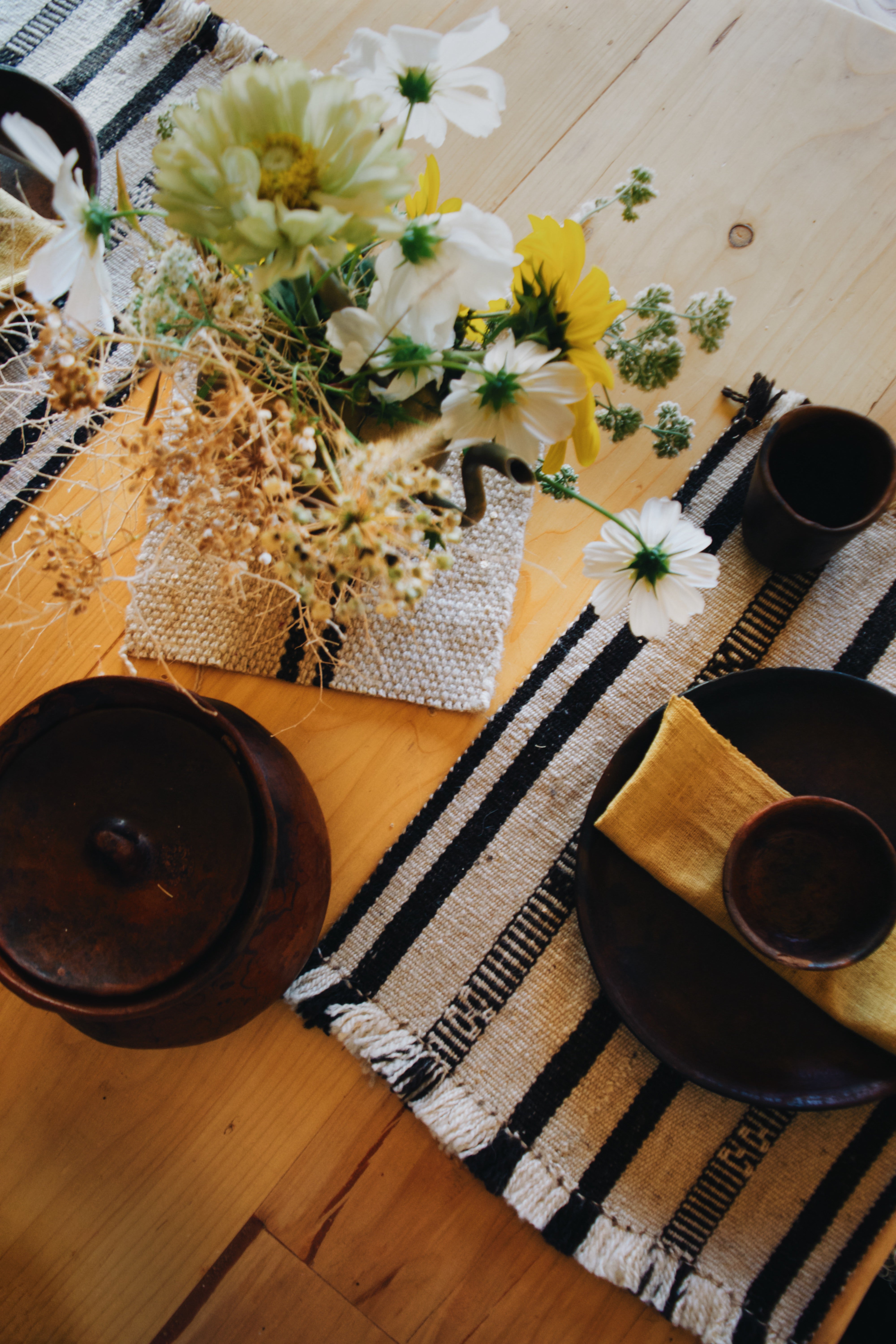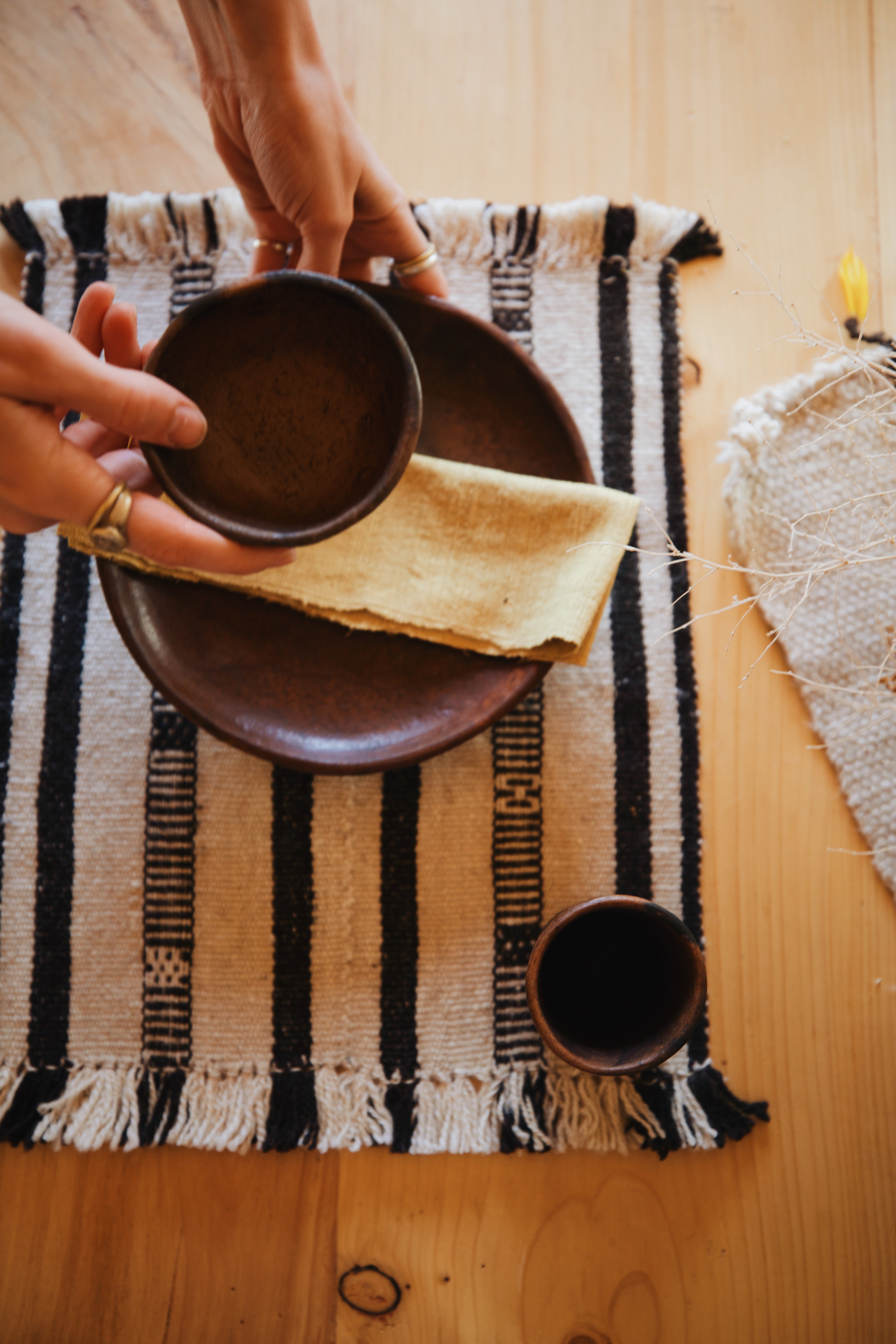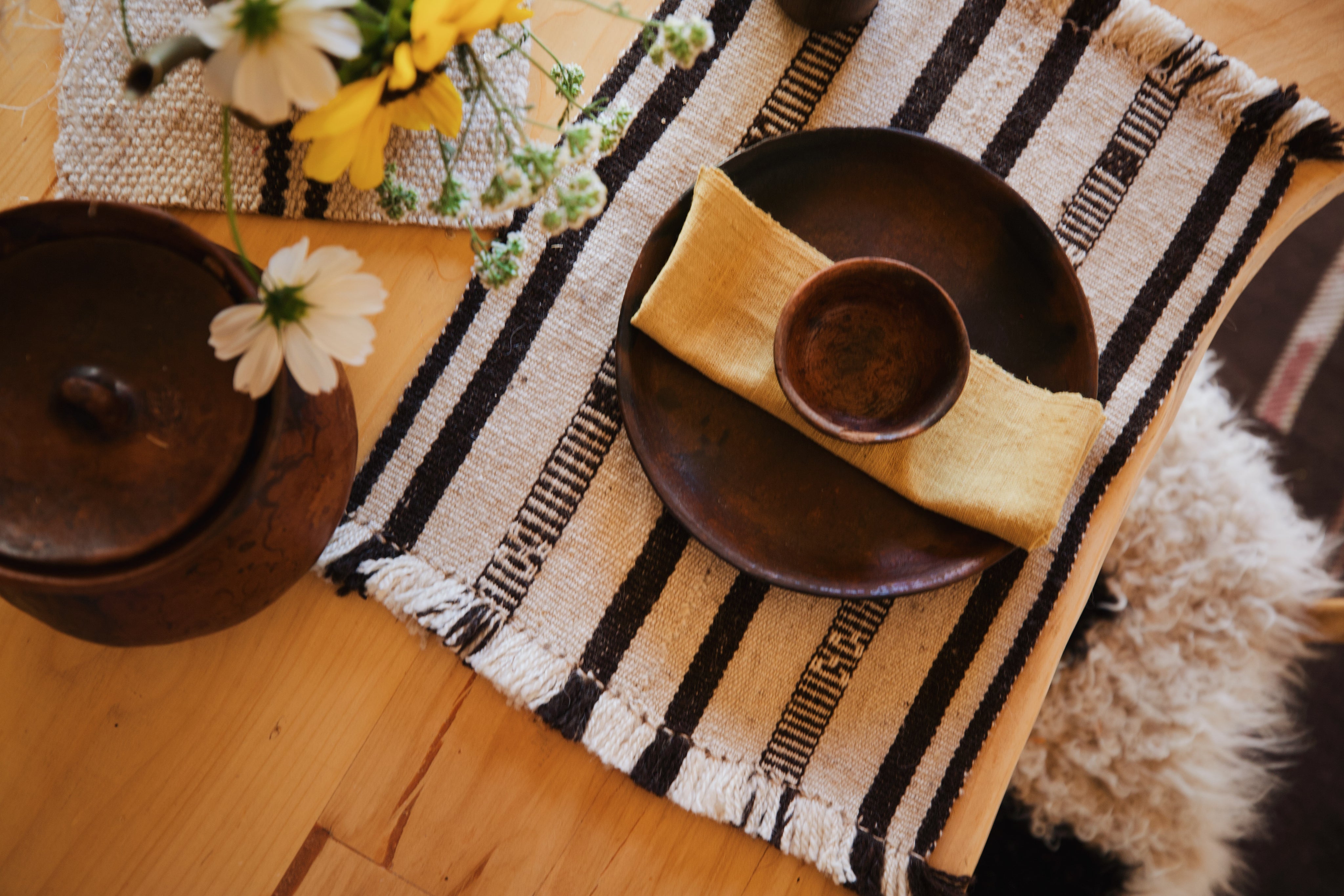 This pair of table mats is made from hand-spun sheep wool yarn. It is woven in the traditional Changthang style, on a portable backstrap loom characteristic for the nomadic communities. The design depicts dice which have been extensively used in the nomadic culture, being a tool to decide on when to move camps, who will be the next village head and of course, also as a game. Two panels are stitched together in the center with a traditional stitching technique of the Changthang nomads. It is spun and woven by our team of settled nomads close to the city of Leh. Additional information about the weaving and the tradition here.